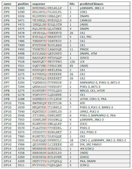 Predicted phosphorylation sites in the LIV-1 family of ZIP transporters. This table only includes the predicted sites on the cytoplasmic loop between TM3–4 and only those sites that were confirmed positive by mass spectrometry studies as detailed in the Phosphositeplus software [49] with occurrences listed in the hits column. Phosphorylated residues are shown in red. ZIP12 and ZIP13 are omitted as they did not have any predicted sites that met these criteria. Kinase predictions were taken from a number of prediction sites and those not reaching the cutoff in NetPhos [50] are shown in brackets.t.
