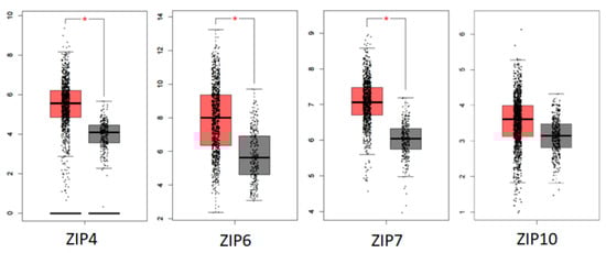 LIV-1 family members that are increased in invasive breast carcinoma tissues. This analysis was performed using Gepia [63] comparing the gene levels in 1085 tumors to 291 normal samples as transcripts per million. ZIP4, ZIP6 and ZIP7 all showed a statistically significant increase in breast tumor samples (red) compared to normal tissues (grey). ZIP10 levels also appeared to increase in the tumors but not significantly. The remainder of the LIV-1 family members did not show any increase and were excluded. * p < 0.05.