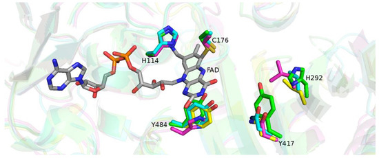 Five residues in Q8GTB6 are critical for its activity—two FAD-anchoringresidues, His-114 and Cys-176, which are covalently bonded to FAD, and three catalytic residues, His-292, Tyr-417, and Tyr-484 [6]. Table 3 and Figure 2 show critical residues in Q8GTB6 and the structurally aligned residues in the AlphaFold models of the orthologues. A0A1J6KPK0 contains both the FAD-anchoring residues and the corresponding Tyr-484 residue, whilst His-292 and Tyr-417 are not conserved. The orthologues do not retain amino acid chemical properties for the following positions: His-292 is altered to a hydrophobic residue (Val-291 or Leu-286) and Tyr-417 is changed to an Asn residue (Asn-211, Asn-408, and Asn-394, respectively).