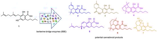 Cannabis sativa L. is an annual herbaceous plant that has been widely used due to its industrial [1], ornamental [2], and pharmaceutical [3] applications. Cannabis sativa contains at least 113 cannabinoid compounds; these cannabinoids exhibit a range of unique pharmacological and therapeutic properties. Despite the report of biosynthesis of tetrahydrocannabinolic acid (THCA) (2) and cannabidiolic acid (CBDA) (3) using yeast [4], the biosynthetic pathways of most of these cannabinoids remain largely unknown, making it difficult for medicinal cannabinoids to be produced in a stable and sustainable manner [5]. Chemical synthesis of these cannabinoids remains a challenge due to their complex chemical structures. Most of the well-known and studied cannabinoids are derived from cannabigerolic acid (CBGA) (1). Five of the products, THCA (2), CBDA (3), cannabicyclolic acid (4), cannabichromenic acid (5), and cannabicitranic acid (6), are structural isomers (C22H30O4); only cannabielsoic acid B (CBEA) (7) is unique, due to an additional oxygen atom (C22H30O5) (Scheme 1).