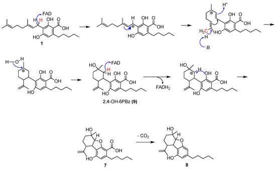 CBEA (7) is different from the rest of the carboxylated products in Scheme 1 due to an additional oxygen atom; CBE (8) is the decarboxylated product of CBEA (7) and has previously been reported as an oxidative product from CBDA (3) [15]. Analogous to previously determined oxidative cyclization mechanisms of CBGA (1), we propose that it begins with the formation of the carbocation in the monoterpene moiety and the corresponding reduction of FAD to FADH2 (Scheme 4). The secondary carbocation that is formed rearranges to a more stable tertiary carbocation. Then, a proton is extracted from a terminal methyl group of the octadienyl chain by a general base, and a cascade of electron pair movements forms the cyclohexyl ring. Thereafter, we propose a nucleophilic attack of the first carbocation intermediate (presumably by a nucleophile derived from a H2O molecule) to form 2,4-dihydroxy-3-[2-hydroxy-2-methyl-5-(2-propenyl)-cyclohexyl]-6-pentyl-benzoic acid (2,4-OH-6PBz) (9). A second carbocation forms with the corresponding reduction of a second FAD molecule to FADH2 and a final cyclization step produces CBEA (7). We propose that a spontaneous decarboxylation occurs to form the final product, CBE (8).