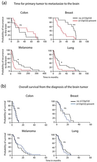 2.3. Δ133p53β Was Associated with a Reduced Time to Metastasize to the Brain