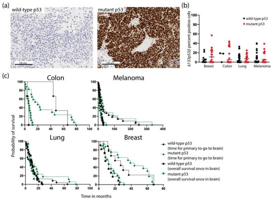We next investigated whether there was an association between Δ133p53β expression and mutant p53, as mutant p53 promotes metastasis [10]. Immunohistochemistry was used as a surrogate for identifying tumors with mutant p53 based on mutations in p53 increasing the stability of the p53 protein. Strong widespread expression of p53 consistent with mutant p53 was assigned to 56% of breast metastases (n = 15/27), 86% of colorectal metastases (n = 18/21), 39% of lung metastases (n = 18/46) and 41% of melanoma metastases (n = 19/46). All tumors designated as mutant for p53 showed strong nuclear staining in almost 100% of the tumor cells (Figure 3a). There was no correlation between the presence of mutant p53 and Δ133p53β using RNAscope (Figure 3b). Mutant p53 in the brain metastases was not associated with reduced time for the primary tumor to metastasize to the brain or overall patient survival once the tumor was detected in the brain (Figure 3c).