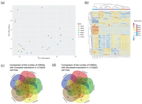 Introduction of Δ133p53α and Δ133p53β to H1299 cells resulted in distinct but overall subtle changes in gene expression. (a) Principal component analysis showing cell lines expressing Δ133p53α or Δ133p53β clustered distinctly from control cells without Δ133p53 isoforms. (b) Top 200 most variable genes clustered control cells together, but not Δ133p53α or Δ133p53β cell lines. (c) Venn diagram of transcripts increased in Δ133p53α and/or Δ133p53β cell lines. (d) Venn diagram of transcripts decreased in Δ133p53α and/or Δ133p53β cell lines. Alpha 1, Δ133p53α1; Alpha 2, Δ133p53α2; Alpha 8, Δ133p53α8; Beta 5, Δ133p53β5; Beta 10, Δ133p53β10; Control, H1299 p53 null.