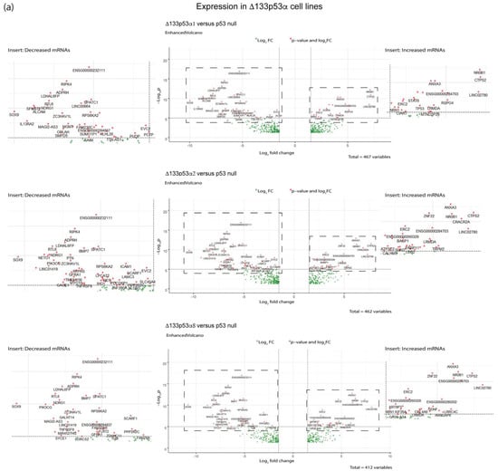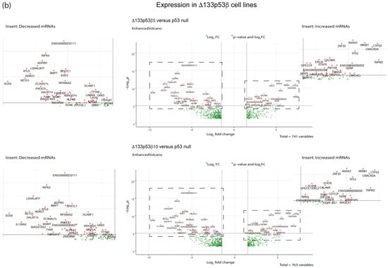 Volcano plots of gene transcripts altered in Δ133p53α or Δ133p53β cells compared with the control (p53 null). (a) Transcripts increased and decreased in Δ133p53α cell lines and (b) transcripts increased and decreased in Δ133p53β cell lines. Transcripts highlighted in red were considered statistically differentially expressed (criteria of false discovery rate (FDR) < 0.05 and log2 fold change of ±1.5 (FC ± 1.5)). Boxed areas shown as inserts to the left and right.