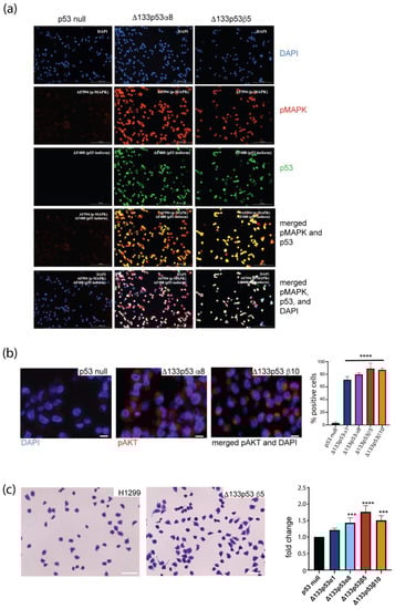 The RNAseq analysis showed subtle changes in gene expression with the introduction of Δ133p53α or Δ133p53β. To determine whether growth-promoting signaling was increased overall in Δ133p53 cells, immunofluorescence for p-MAPK, p-AKT and major downstream effector pathways in oncogenic signaling was performed. Δ133p53 cells showed marked increases in p-MAPK- and p-AKT-positive cells (Figure 6a,b).