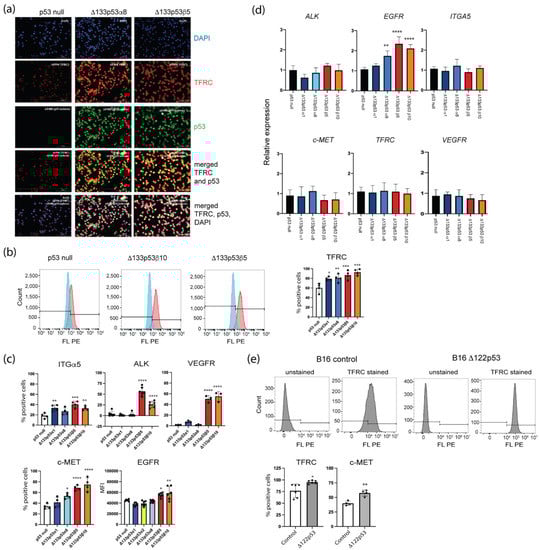 Whether Δ133p53 isoforms could increase cancer-promoting proteins on the surface was tested further using B16 murine melanoma cell lines expressing wild-type p53 or Δ122p53 (a mimic of Δ133p53α function) [20]. Flow cytometry revealed increased c-Met and TRFC in Δ122p53 cells compared with the control (Figure 7e).