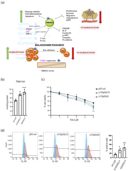 The decreased expression of NDGR1 and increased TFRC on the cell surface were consistent with the role of Δ133p53β in promoting cancer (Figure 8a). Since both TFRC and NRDG1 also have opposing functions in iron regulation and increased TFRC can reduce cell viability upon ferroptosis induction with the GPX inhibitor (1S,3R)-RSL3 (RSL3) [21], we investigated whether the increased TFRC on the cell surface would make Δ133p53 cells more susceptible to iron-related cell death. Consistent with Δ133p53β having increased TFRC expression, Δ133p53β cell lines had increased intracellular total iron concentrations relative to the total protein (Figure 8b). Upon ferroptosis induction with RSL3, Δ133p53β cells showed reduced viability and increased cellular lipid peroxides (Figure 8c,d).