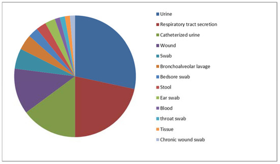 The origin (specimen types) of the multidrug-sensitive P. aeruginosa strains included in the study (n = 74).