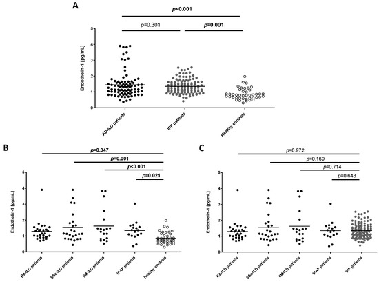 Differences in ET-1 serum levels in all the individuals included in the study. (A) Comparison of ET-1 levels between all the study groups; (B) Comparison of ET-1 levels between each type of AD-ILD patient and healthy controls; (C) Comparison of ET-1 levels between each type of AD-ILD and IPF patient. Horizontal bars indicate the mean value of each study group. Significant results are highlighted in bold.