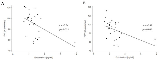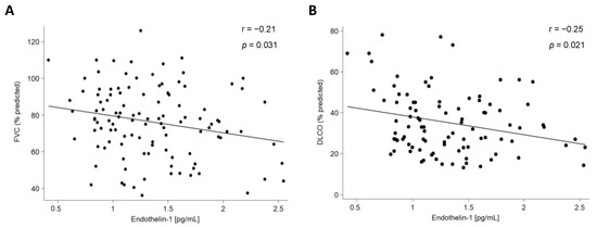 We also assessed the relationship of ET-1 serum levels with the clinical characteristics of all the patients included in this study. Regarding pulmonary function tests (PFTs), a negative correlation between ET-1 serum levels and both forced vital capacity (FVC) and diffusing capacity of the lungs for carbon monoxide was disclosed in IPF patients (Figure 3, Table 1). Likewise, a negative correlation between ET-1 serum levels and FVC and forced expiratory volume in one second (FEV1) was found in AD-ILD patients (Table 1). This finding was specifically related to RA-ILD patients (Figure 4, Table S2).