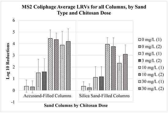 Average log10 reduction values (LRVs) with standard deviation error bars for MS2 coliphage in water treated by chitosan coagulation and Accusand and silica sand column filtration, based on 17 successive samples collected throughout the 57-day experiment period.