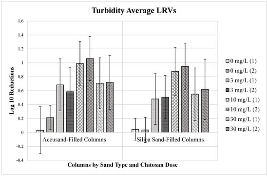 Average log10 reduction values (LRVs) with standard deviation error bars for turbidity in water treated by chitosan coagulation and Accusand and silica sand column filtration, based on 17 successive samples collected throughout the 57-day experiment period.