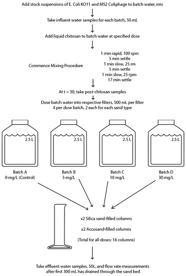 The purpose of this laboratory study was to assess the efficacy of chitosan as a coagulant–flocculant in natural waters, followed by treatment with sand filters. Variables such as optimal dosage of chitosan, sand grain size, and flow rate were evaluated for their potential effect on turbidity and microbe reduction. The reductions in turbidity and the indicator microbes of bacteria and viruses were compared to the WHO household water-treatment performance targets. Protozoan parasites were not included in this study because there is documented evidence that physical removals of viruses and bacteria, which are smaller in size than protozoans, would provide sufficient evidence for performance efficacy of these microbial removal processes, including protozoan parasites [20].