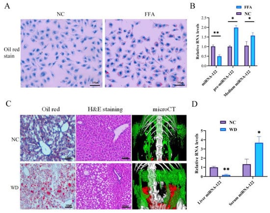 The increased excretion of miRNA-122 from intra-hepatocyte to extra-hepatocyte reduced the level of miRNA-122 in the liver. (A) Oil red O staining validated the steatosis in L02 cells without FFA-induced as normal control (NC) and the steatosis in L02 cells with free fatty acid induced (FFA), respectively (40×). (B) RT-qPCR analysis of miRNA-122, pre-miRNA-122, and medium miRNA-122 in L02 cells with normal control (NC) or FFA-induced steatosis (FFA), respectively, (n = 3). (C) The validation of oil red staining, H&E staining, and micro-CT (relative quantitative measurement of abdomen adipose tissue [red] and subcutaneous fat [green]) in Western diet-fed mice (WD) and normal diet-fed mice (NC). (D) RT-qPCR analysis of miRNA-122 in liver tissue and serum of WD and control mice, (n = 6). (* p < 0.05; ** p < 0.01).