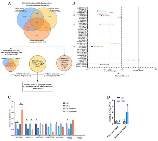 StarBase (https://starbase.sysu.edu.cn, accessed on 19 March 2021), Circbank (http://www.circbank.cn/, accessed on 19 March 2021), and ENCORI (https://starbase.sysu.edu.cn, accessed on 19 March 2021) databases were used to predict which circRNAs could sponge to miRNA-122, and we Venn mapped the main dataset. The circRNAs in the main dataset were separately intersected with liver-specific circRNAs in the CircBase database (http://www.circbase.org/, accessed on 19 March 2021), and the top 20 circRNAs sponging to miRNA-122 were identified. The ENCORI predicted circRNAs were searched in the PubMed GEO dataset of NAFLD mouse circRNA expression profile (GSE134146) to filter the predictive circRNAs that were specifically sponged to miRNA-122.