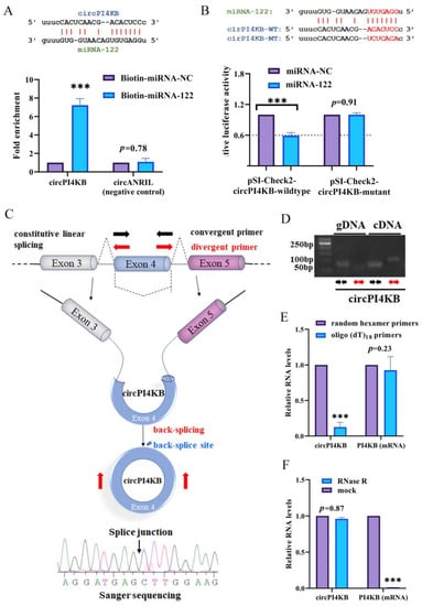 2.3. circPI4KB Binds to miRNA-122 and Validation of the Circular Structure of circPI4KB