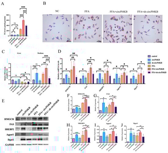 circPI4KB transported the protective miRNA-122 to extra-hepatocyte, resulting in lipid deposition in hepatocyte due to decreased intra-hepatocyte level of miRNA-122, (n = 3). (A) Enzyme-linked immunosorbent assay was used to detect the level of TG in each group. (B) Oil red O staining validated the steatosis in L02 cells with FFA-induced and overexpressed (circPI4KB) or inhibited plasmids (sh-circPI4KB) transfected, respectively (40×). (C) RT-qPCR showed the level of expression of intra- and extra-hepatocyte miRNA-122 after transfection with overexpressed (circPI4KB) or inhibited plasmids (sh-circPI4KB). (D) RT-qPCR analyses showed the modification of mRNA and protein levels of miRNA-122-downstream cholesterol synthesis (HMGCR, FAS, SREBP2) and TG synthesis (Agpat1 and Dgat1) after overexpressing or inhibiting circPI4KB. (E–J) Western blot (E) and gray value analysis (F–J) showed the protein levels of HMGCR, FAS, SREBP2, Agpat1, and Dgat1 after overexpressing or inhibiting circPI4KB. (* p < 0.05; ** p < 0.01; *** p < 0.001; ns: not significant).