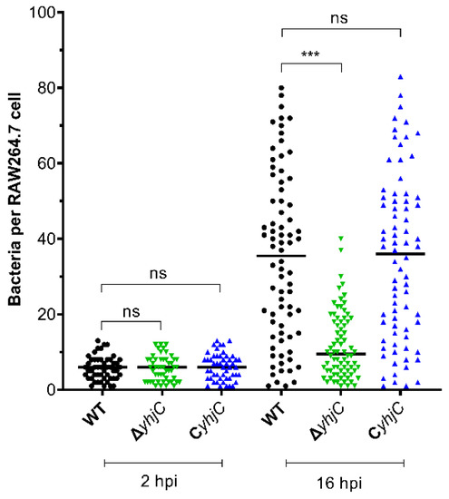 To further confirm that yhjC contributes to S. Typhimurim replication in macrophages, the bacterial numbers of S. Typhimurim per RAW 264.7 cell at 2 and 16 hpi were counted. At 2 hpi, each 264.7 macrophage contained an average of less than 6 WT or ΔyhjC bacteria. However, at 16 hpi, each RAW 264.7 cell contained an average of ~35 WT bacteria, while the average number of ΔyhjC bacteria per 264.7 cell was ~12. In contrast, the mean count of CyhjC was 34, which was comparable to that of WT (Figure 2). Thus, immunofluorescence assay also showed that the deletion of yhjC reduced the number of S. Typhimurium in macrophages, and the complementation of yhjC to ΔyhjC restored the number of S. Typhimurium in macrophages to WT level.