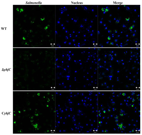 Representative images of RAW264.7 cells infected by WT, ΔyhjC, and CyhjC bacteria at 16 hpi. Bacteria were labeled with anti-Salmonella antibody (green), and cell nuclei were stained with 4′,6-diamidino-2-phenylindole (DAPI, blue).