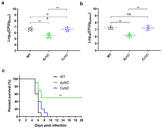 The role of yhjC in S. Typhimurim virulence to mice was next investigated. Mice were intraperitoneally (i.p.) infected with 1 × 104 CFU (colony forming units) of WT, ΔyhjC or CyhjC, the survival rates of infected mice were recorded daily and bacterial CFU in mouse liver and spleen, at day 3 post-infection, were counted. As shown in Figure 4a,b, the deletion of the yhjC gene significantly reduced the CFU number of S. Typhimurium in mice liver and spleen, and the CFU number of CyhjC in the liver and spleen of infected mice was similar to that of WT, indicating that the yhjC gene contributed to the colonization of S. Typhimurium in the liver and spleen of mice. As shown in Figure 4c, the survival rate of mice infected with ΔyhjC increased significantly, compared to the survival rate of mice infected with WT (Figure 4c). In addition, the survival rate of mice infected by CyhjC was similar to that of WT-infected mice. The final survival rate of mice infected with WT and CyhjC was 0, whereas the final survival rate of mice infected with ΔyhjC was about 50%. These results collectively indicated that yhjC gene contributed to systemic infection by S. Typhimurium.