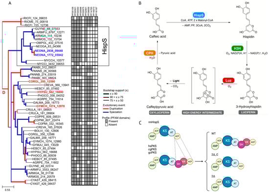 In bioluminescent Agaricales, the biosynthesis of hispidin from caffeic acid is carried out by type I polyketide synthases, large enzymes composed of multiple domains with various enzymatic activities. Hispidin synthases from species within the bioluminescent clade are composed of five predicted domains: the AMP-binding domain, the acyl carrier protein domain, the ketosynthase (N- and C-terminal domains), the acyltransferase, and another C-terminal acyl carrier protein domain. At the same time, orthologous enzymes from related non-bioluminescent fungi generally contain two additional domains with predicted ketoreductase and dehydratase activities (Figure 1A and Figure 2).