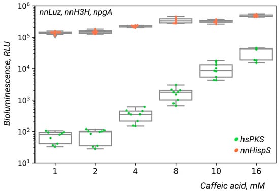 Interestingly, when treated with ferulic acid or its combination with caffeic acid, we did not observe an increase in luminescence compared to caffeic acid alone (Figure 4E). Upon treatment with ferulic acid, both enzymes demonstrated spectral shifts: red-shifted luminescence in the case of nnHispS and blue-shifted, in the case of hsPKS (Figure 4F,G). However, when treated with a 10-to-1 combination of caffeic and ferulic acids both enzymes preferred caffeic acid. At a 10 mM concentration of the substrates, both yeast strains did not survive, while control strains—lacking polyketide synthase and empty strains—grew normally. This result suggests the potential toxicity of combinations of ferulic or caffeic acid-derived alpha-pyrone(s) synthesised by the assayed enzymes.