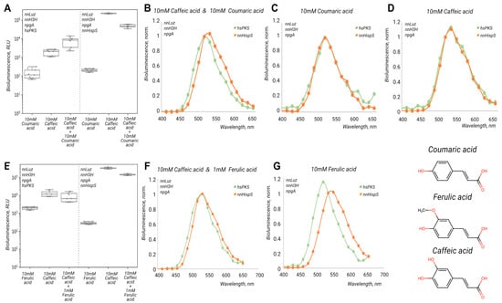 (A) Luminescence of Pichia pastoris colonies expressing nnLuz, nnH3H, npgA, and either full-length hsPKS (green) or nnHispS (orange), after treatment with coumaric acid, caffeic acid, or their equimolar combination. Bioluminescence spectra were normalised to 518 nm after treatment with (B) caffeic and coumaric acids, (C) coumaric acid only, and (D) caffeic acid only. (E) Integral luminescence of yeast colonies after treatment with ferulic acid, caffeic acid, or their equimolar combination. Bioluminescence spectra were normalised on 518 nm after treatment with (F) caffeic and ferulic acids, and (G) ferulic acid only.