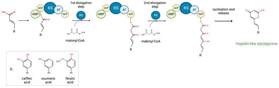 Proposed biosynthetic mechanism of styrylpyrones by nnHispS depending on a substrate. KS—ketosynthase, AT—acyltransferase, ACP—acyl carrier protein, AMP—AMP-binding domain.