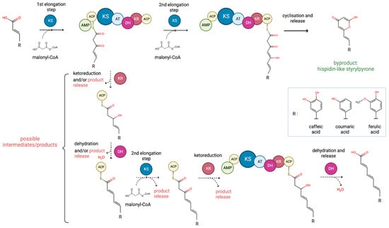 We showed that polyketide synthase from Hypholoma sublateritium is able to produce hispidin-like styrylpyrones from caffeic, p-coumaric, and ferulic acids, however, its main reaction product remains unknown. Although the prediction of type I polyketide synthase products from their sequence becomes more and more advanced [21,22,23,24], none of the published tools we tested were able to generate the correct prediction—hispidin—for nnHispS. Thus, we did not consider bioinformatic predictions of reaction products in our analysis of the consequences of domain loss in polyketide synthases. Nevertheless, we attempted to rationally consider reaction products catalysed by nnHisps (Figure 5) or hsPKS (Figure 6) based on existing data on type I polyketide synthase catalysis [20].