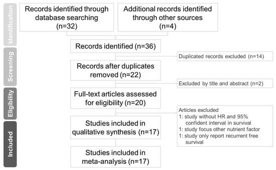 The literature search and selection process are summarized in Figure 1. A total of 36 articles were identified through structured database searches. After the removal of 14 duplicate articles and 2 nonrelevant articles, 20 full-text articles were assessed for eligibility. Among the remaining studies, 3 studies that failed to meet the inclusion criteria were removed. The present meta-analysis included a total of 17 studies.