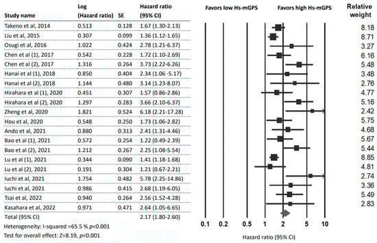 Fifteen studies [7,14,15,16,22,23,24,25,26,27,28,29,30,31,32] (20 datasets and 5545 patients) reported an association between the HS-mGPS and OS. The pooled analysis detected a significant association between a high HS-mGPS and poor OS in cancer patients (HR = 2.17; 95% CI: 1.80–2.60; p < 0.001) with moderate heterogeneity (I2 = 65.5%; pH < 0.001; Figure 2).