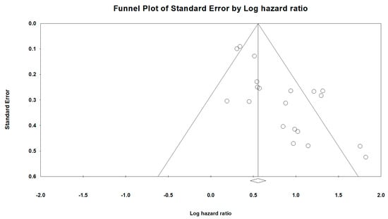 A visual inspection of the funnel plots that were designed to estimate the publication bias for OS of the HS-mGPS (Figure 4) revealed obvious asymmetry, indicative of an insufficient number of studies, which were characterized by small HRs and small sample sizes. Significant publication bias was also confirmed by Begg’s test (p < 0.001) and Egger’s test (p < 0.001). Therefore, we used the trim-and-fill method to evaluate the influence of publication bias on the pooled results. The results from the trim-and-fill calculation indicated a pooled HR of 1.63 (95% CI: 1.34–2.00; p < 0.001) for OS prediction after adding the missing studies. The smaller adjusted HR did not alter the direction or significance of the results, a finding that supports the validity of this meta-analysis. In addition, sensitivity analyses were conducted through the individual omission of studies from the pooled analysis to assess the stability of the results with regard to OS (Supplementary Table S3). The removal of any individual study did not significantly alter the influence of the HS-mGPS on OS, reinforcing the reliability of our results.