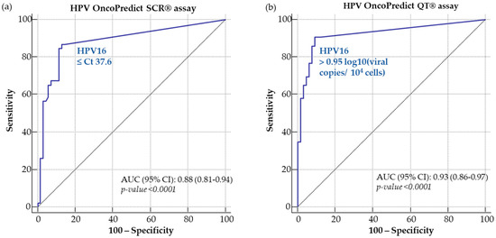 ROC curve analysis for the definition of cutoffs of HPV16 for OncoPredict HPV® SCR (a) and QT (b) assays.