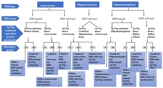 In 2016, CNS WHO released the latest update of tumor classification on the basis of the latest studies on molecular characterization [26]. Genomic sequencing efforts provided unprecedented insight into the genomic aberrations and cellular signaling mechanisms that drive these cancers, and discoveries from these efforts translated into novel diagnostic algorithms, biomarkers, and therapeutic strategies in neuro-oncology. These sequencing efforts helped revise WHO classification of nervous system tumors, and histologic and molecular parameters were incorporated into the diagnostic catalog [26,27]. Several diagnoses were restructured (diffuse gliomas, medulloblastomas, and embryonal tumors), and novel tumor entities were introduced. For this purpose, researchers at WHO used the datasets generated by The Cancer Genome Atlas (TCGA) and related gene expression and DNA methylation signatures with prognosis. Compared to the previous release, the principal change in the new classification is the relevant reorganization of diffuse gliomas, according to the IDH status, co-deletion of chromosome arms 1p and 19q, and MGMT methylation. The status of isocitrate dehydrogenase 1 and 2 (IDH1/2) enzymes are key reference genes for brain tumor classification. Mutations of IDH1 and IDH2 lead to a favorable outcome [28] and have more prolonged overall survival in comparison to those with IDH wild type. High-grade gliomas with IDH wild type have shorter overall survival, while low-grade gliomas display a poor glioblastoma (GBM)-like trajectory. The new diagnostic criterion for oligodendroglioma is the allelic loss of chromosomes 1p and 19q [29]. Although MGMT is not considered a valid predictive biomarker in diffuse gliomas, it is a prognostic biomarker (Figure 1) [30].