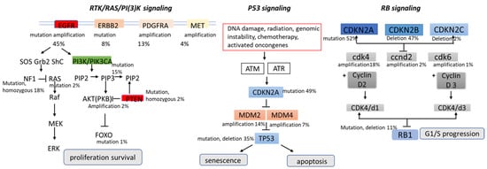 The PI3K/AKT/mTOR signal transduction pathway and the Ras/MAPK pathway are hyperactivated in several cancer types, including glioblastoma, and play a key role in tumorigenesis by activating the tumor promoters and inhibiting the tumor suppressors. Several growth factors activate PI3K (e.g., human EGFR family and platelet-derived growth factor receptor (PDGFR) family growth factors). RTKs are frequently activated in malignant gliomas, such as EGFR gene amplification, which occurs in approximately 40% of patients with GBM, and PDGFRA gene amplification, which occurs in up to 16% of GBM [33,34,35,36]. At the same time, the EGFR variant (EGFRvIII) shows ligand-independent constitutive activation of the receptor. This deletion mutant is observed in approximately 30% to 50% of EGFR-amplified gliomas [37]. Downstream signaling from growth factor receptors can be activated by loss or mutation in the neurofibromatosis 1 gene (NF1), mutations in KRAS, mutations in PIK3CA (the gene for PI3K), and deletion or loss of heterozygosity of PTEN. PI3K participates in the phosphorylation of AKT and promotes cellular proliferation by inactivating cell cycle inhibitors and promoting cell cycle proteins. The PTEN tumor suppressor gene is inactivated in 40–50% exclusively in primary glioblastomas and usually inhibits the PI3K/Akt pathway [38].