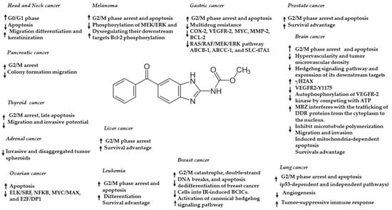 Anticancer effects and mechanisms of action of MBZ in different cancers. ↑ upregulation/activation; ↓ downregulation/inhibition.