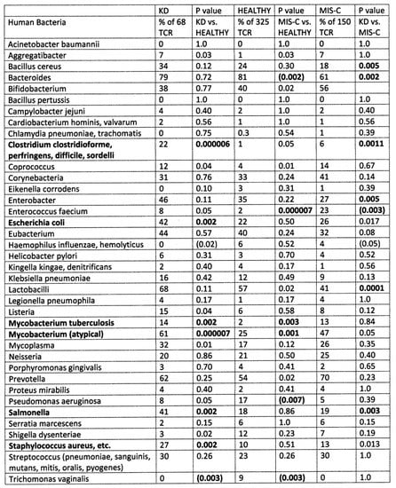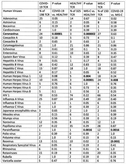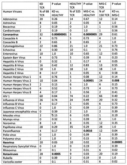 The results of the study of the TCR from healthy individuals were compared to the TCR sequence similarities derived from hospitalized individuals with moderate-to-severe COVID-19 (198 TCR), MIS-C patients (150 TCR), and patients diagnosed prior to COVID-19 with Kawasaki disease (KD) (69 TCR) (sources again are provided in the Section 4). Significant differences between the frequency of similarities found among the healthy and disease TCRs was determined initially using a chi-squared analysis supplemented by Bonferroni corrections because each TCR sequence was compared with multiple viruses and bacteria. A significant correction at the p < 0.05 level after Bonferroni corrections required that the chi-squared p value be less than 0.002. Values near or below this value are bolded in figures that follow for ease of identification.