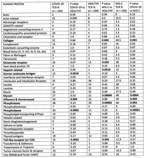 Figure 3 compares 325 healthy TCRs with 198 moderate-to-severe COVID-19 TCRs and 150 MIS-C TCRs in terms of their human protein mimicry. Every human TCR mimics some range of human proteins [8,9] so that, in a sense, the immune system represents a “body double” of the proteome that can intercept threats to the host. In the case of COVID-19, TCRs mimicking human leukocyte antigens (HLA), Toll-like receptors (TLR), olfactory receptors and phospholipases are significantly increased compared with TCRs from healthy individuals. These targets may indicate that autoimmunity involves the dysregulation of immunity (HLA and TLR) with olfactory receptors (anosmia) and anti-phospholipid syndrome (APS) as the most common results. Increases were also observed in the mimicry of other proteins that did not reach statistical significance in this study, such as cardiomyopathy-associated proteins and thrombospondin, which may indicate that subsets of the COVID-19 group experienced autoimmunity related to these targets. Unfortunately, the autoimmune complications were not listed for any of the COVID-19 individuals so that it was not possible to provide a breakdown or sub-analysis. In contrast, the TCRs of MIS-C patients showed significantly increased similarities to collagen and myosin, as might be expected in autoimmune cardiopathies; heparin-related proteins such as heparin sulfate sulfotransferases and phosphatases, which may relate to MIS-C coagulopathies; and glutamate receptors, which may impact vascular and muscle function. MIS-C TCRs shared only one enhanced set of similarities with COVID-19 TCRs, which was to mimic TLR, again suggesting autoimmunity involves dysregulation within the immune system itself. These results suggest that the average severe COVID-19 patient experiences a different set of autoimmune targets than the typical MIS-C patient.