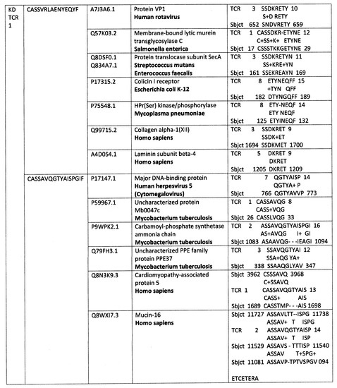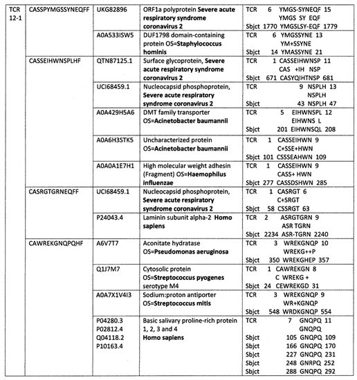 Where sequenced sets of TCRs for individual patients were available, a more in-depth analysis of the relationship between the triangle of viral, bacterial and host protein mimicry was possible. A very limited example consisting of only four TCRs from a single surviving COVID-19 patient from a study by Schultheiss et al. [74] is presented in Figure 4 and three additional more extensive sets are provided in Appendix A. What is notable about each of these sets is that, as expected from the statistical results reported in Figure 1, some of the TCRs significantly mimic SARS-CoV-2 sharing six or more identical amino acids in a series of ten or five identical amino acids in a row (and often some additional conserved amino acid substitutions). Such sequences have a high rate of probability of demonstrating cross-reactivity in antibody studies [68,69,70,71,72,73]. Some of the TCRs also significantly mimic bacterial infections associated with severe COVID-19, such as Streptococci, Staphylococci, E. coli, Pseudomonas aeruginosa, Haemophilus influenzae, and Acinetobacter baumannii. Although not all of these bacterial similarities rose to significance in the statistical study (Figure 2), it may be possible that they represent co-infections in the particular individual. Additionally, many of the TCRs also mimic human proteins targeted by autoimmune processes during severe COVID-19, such as olfactory and taste receptors, phosphatases targeted in APS, blood proteins associated with coagulopathies, and heart-related proteins such as laminins, collagens and myosin. Again, although not all of these similarities rose to statistical significance for the COVID-19 population, they may indicate unique targets for specific individuals. Figure 3 also displays multiple similarities between one of the expanded COVID-19-related TCRs and mucins, which function as essential antibacterial proteins, perhaps indicating that various aspects of immune function are targets of autoimmunity in some patients. The fact that so many of these proteins show up in sets of TCRs from individual patients but not in the statistical results summarized in Figure 3 is likely due to the fact that each of the patients illustrated in Figure 4 and Appendix A has a unique distribution of human protein matches, diluting their statistical significance across the population of COVID-19 TCR sequences. This dilution effect should not blind us to the possibility that the individualized analysis of TCR mimicry may provide more nuanced insights into individual autoimmune complications.
