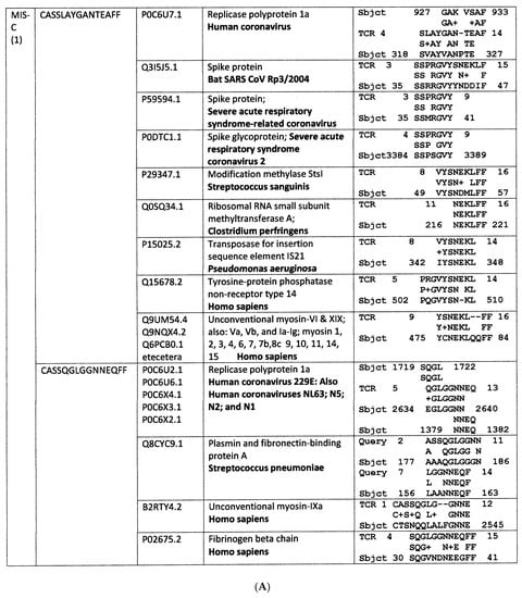 Similarity searches comparing TCR sequences with virus, bacteria and human proteins were carried out using the standard protein BLASTp (protein–protein similarities) at the National Center for Biotechnology Information (NCBI) at the National Library of Congress, Washington, DC, USA. (https://blast.ncbi.nlm.nih.gov/Blast.cgi?PAGE=Proteins, accessed between 1 January 2020 and 1 November 2022). Each TCR sequence was input as a FASTA sequence; the UniProtKB/SwissProt database was selected with an appropriate organism limitation (viruses, taxid 10239; bacteria, taxid 2; homosapiens, taxid 9606). The general parameters were set with 250 sequences to display; threshold at 0.5; initiating word size, 2; BLOSSUM80; and filtering for low-complexity regions. The human matches were limited to E < 101 after the search was completed so as to ensure high-quality matches. The resulting matches were hand-curated to identify the approximately 40 viruses, bacteria and human proteins analyzed in the figures presented in this study. Selection of these particular viruses and bacteria was based on a previous study [8] in which their similarity profiles were evaluated in terms of type 1 diabetes and Crohn’s disease. The human proteins chosen for analysis were chosen in terms of their likelihood of being involved in coagulopathies [69,70], myocardial [119,120] or vascular [128,129,130] or olfactory/taste [150] autoimmune diseases associated with COVID-19 and included a number of “negative control” proteins such as keratins, mucins and tropomyosin that were not expected to be targets.