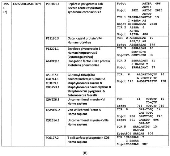 (A,B) Selected TCR sequences from a MIS-C patient [79] and their similarities to viral, bacterial and human proteins found by BLAST. Not only does each TCR sequence mimic a virus, bacterium and/or human protein, the figure also illustrates that many of these viral, bacterial and human proteins mimic each other. Additionally, the specific human proteins identified by this analysis correspond with well-known targets of autoimmune processes associated with MIS-C, including cardiomyopathies (myosins) and coagulopathies (von Willebrand Factor, fibrinogen and plasmin). Numbers in the second column from the left are the UNIPROT identifiers.