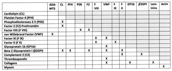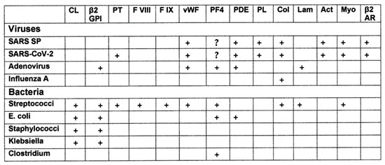 Summary of experimental results of binding to proteins targeted by autoimmune processes in COVID-19 by rabbit polyclonal SARS-CoV-2 antibodies, human anti-SARS-CoV-2 antibodies and similar antibodies against other infectious agents associated with COVID-19 summarized from [69,70,103,104,105,106]. Plus signs (+) indicated significant binding found between the antibody (left-hand column) and the human protein antigen (top row). Question marks (?) indicate that contradictory findings were reported by different studies, some observing significant binding while others reported no binding. CL = cardiolipin; β2GPI = beta 2 glycoprotein 1; PT = prothrombin; F VIII = factor VIII; F IX = factor IX; vWF = von Willebrand factor; PF4 = platelet factor 4; PDE = phosphodiesterase; PL = phospholipid; Col = collagen; Lam = laminin; Act = actin; Myo = myosin; β2AR = beta 2 adrenergic receptor. SARS SP = SARS-CoV-2 spike protein.