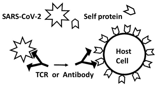 Schematic diagram of the molecular mimicry theory of autoimmune disease induction. A virus, such as SARS-CoV-2, mimics a self-protein on a host cell. The immune system responds by activating T or B cells that express T cell receptors (TCR) and/or antibodies (shown here for simplicity) that are complementary to the viral antigens. Because of the mimicry between the viral antigens and the self-protein, some of the resulting TCRs and/or antibodies may target host cells expressing these self-proteins, resulting in autoimmune disease [109,110,111,112]. While this theory is based on the sort of mimicry observed in expanded TCRs from COVID-19 patients, it actually predicts that the resulting TCR sequences should be complementary to SARS-CoV-2, not similar. Additionally, this theory makes no predictions that would explain TCR mimicry of the select set of bacteria that are found as co-infections in COVID-19.