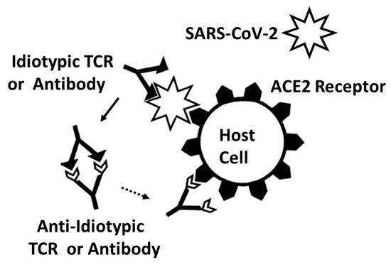 Schematic diagram summarizing the anti-idiotype theory of autoimmune disease induction [113,114,115]. In essence, a virus such as SARS-CoV-2 will induce a TCR and/or antibody idiotypic immune response (antibodies are illustrated for simplicity). If the idiotypic immune response is sufficiently robust, it may induce an anti-idiotypic response (solid arrow). The resulting TCRs or antibodies will then mimic the inducing antigen, in this case SARS-CoV-2, and target the same host cell receptors as does the virus (dotted arrow), in this case, the angiotensin-converting enzyme type 2 (ACE-2) receptor. This theory could explain how expanded TCR sequences mimic SARS-CoV-2 antigens but does not explain how these TCR sequences also mimic host autoantigens or their specific mimicry of bacteria known to co-infect COVID-19 patients.