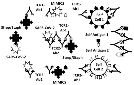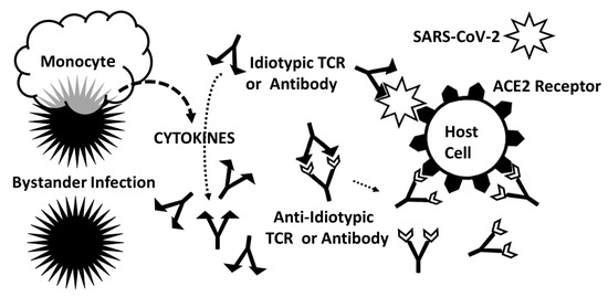 A third possible explanation for the results reported here provides a possible explanation for why anti-idiotypes develop among some autoimmune disease patients and not among most people infected with SARS-CoV-2. Autoimmune disease may require both molecular mimicry of the pathogen for host autoantigens as well as a bystander infection (or infections) to produce a hyperinflammatory environment in which “self” tolerance can be abrogated and anti-idiotype immune responses initiated [116,117,118] (Figure 12). Idiotype–anti-idiotype antibodies or TCRs would result from the mechanism described by the anti-idiotype theory but be enabled by the secondary infection. Notably, the bystander activation theory does not require that there be any specific relationship between the bystander infection and host autoantigens or between the primary (in this case SARS-CoV-2) infection and the bystander infection. The bystander infection supposedly acts essentially as an adjuvant to provoke non-specific up-regulation of innate immunity creating the hyperinflammatory environment in which self-tolerance can be abrogated. Thus, the bystander theory leaves unresolved why only a small and very select set of pathogens were found here to be highly associated both as mimics of COVID-19 TCR sequences and as co-infections in COVID-19. Why, in short, should SARS-CoV-2 seem to require not just any bystander infection but very particular ones? Additionally, the bystander theory still leaves unaddressed the observation that TCR sequences mimic the bacterial agents associated with disease and, like the original anti-idiotype theory, cannot explain the mimicry of TCRs for host autoantigens.