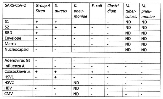 Three predictions of the complementary antigen theory distinguish it from the other theories. One is the prediction that antigens exist on SARS-CoV-2 and its primary bacterial co-infections in COVID-19 that are complementary to each other. This complementarity has been demonstrated experimentally by showing that polyclonal antibodies against SARS-CoV-2 whole virus, or its spike protein, bind specifically and with high (nanomolar) affinity to polyclonal antibodies against several bacteria including group A Streptococci, Staphylococcus aureus and Klebsiella pneumoniae [69,70]. Enterococci were not, unfortunately, tested in these studies. Figure 14 summarizes studies demonstrating that such complementarity between viral and bacterial antibodies is rare.