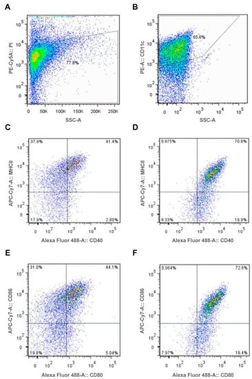 Dendritic cells were stained for 20 min with the following antibodies for analysis: FITC anti-CD40 (3/23), PE anti-CD11c (HL3) both from BD Biosciences; Franklin Lakes, NJ, USA, APC-Cy7 anti-MHCII (M5/114), APC-Cy7 antiCD86 both from BioLegend; San Diego, CA, USA and FITC anti-CD80 (16-10A1) from eBiosciences; Thermo Fisher Scientific, Waltham, MA, USA. Nonviable cells were identified by Propidium iodine (PI) staining. Cells were analyzed on the BD FACSCanto II Flow Cytometer machine; BD Biosciences, Franklin Lakes, NJ, USA using FACSDiva software; BD Biosciences, Franklin Lakes, NJ, USA.
