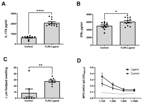 TLR9 ligation of MPO pulsed dendritic cells promotes early MPO autoimmunity. Early Immune Responses. MPO-stimulated mouse splenocyte cytokine production (day 10). (A): Increased production of interleukin 17A (IL-17A) in mice receiving TLR9 stimulated MPO pulsed DCs compared to Control stimulated MPO pulsed DCs. (B): Increased production of interferon gamma (IFN-γ) in mice receiving TLR9 stimulated MPO pulsed DCs. (C): Increased MPO specific dermal DTH response in mice receiving TLR9 stimulated MPO pulsed DCs. (D): No difference in serum MPO-ANCA was observed between groups. Dotted line represents the OD450 of sera from control, OVA immunized mice receiving anti-GBM globulin. Bars show the mean +/− SEM. * = p < 0.05, ** = p < 0.01, **** = p < 0.0001. DC = Dendritic cell. Mouse numbers for experiment: Control: n = 10, TLR9 Ligand: n = 10.