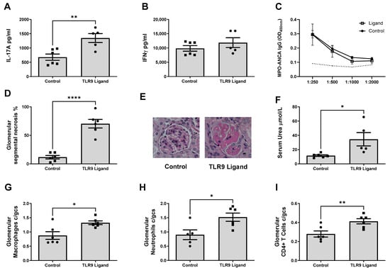Having demonstrated enhanced anti-MPO autoimmunity after transfer of TLR9 stimulated MPO pulsed dendritic cells, we hypothesized that the enhanced immune responses would facilitate glomerular inflammation and injury. Mice were administered a sub-nephritogenic dose of sheep anti-mouse GBM globulin, which does not induce kidney injury if injected into naïve mice, but will only trigger glomerulonephritis in mice with established autoimmunity to MPO by recruiting neutrophils to the glomerulus where they degranulate, depositing MPO triggering anti-MPO T cell recall responses [36]. TLR9 stimulation of MPO pulsed dendritic cells led to an increase in histological kidney injury. More severe glomerular segmental necrosis was seen in mice receiving TLR9 stimulated dendritic cells than mice receiving control stimulated dendritic cells (Figure 3D,E). Mice immunized with TLR9 stimulated MPO pulsed dendritic cells also expectedly developed increased functional kidney injury with elevated serum urea compared to mice immunized with control stimulated MPO pulsed dendritic cells (Figure 3F).